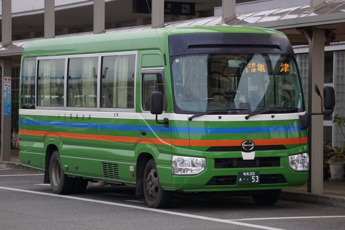 徳之島では、徳之島総合陸運という会社が路線バスを運行している。やがて空港ターミナル前には、この後亀津行きとなるバスが到着した。緑の車体にオレンジのラインを纏った徳之島総合陸運のバス。沖永良部バスもオレンジと青で島のカラーを表していたが、徳之島のバスは緑が印象的である。飛行機から眺めた通り、中央に山が聳える徳之島。その豊かな緑が、この島のイメージを形作っているのだろう。