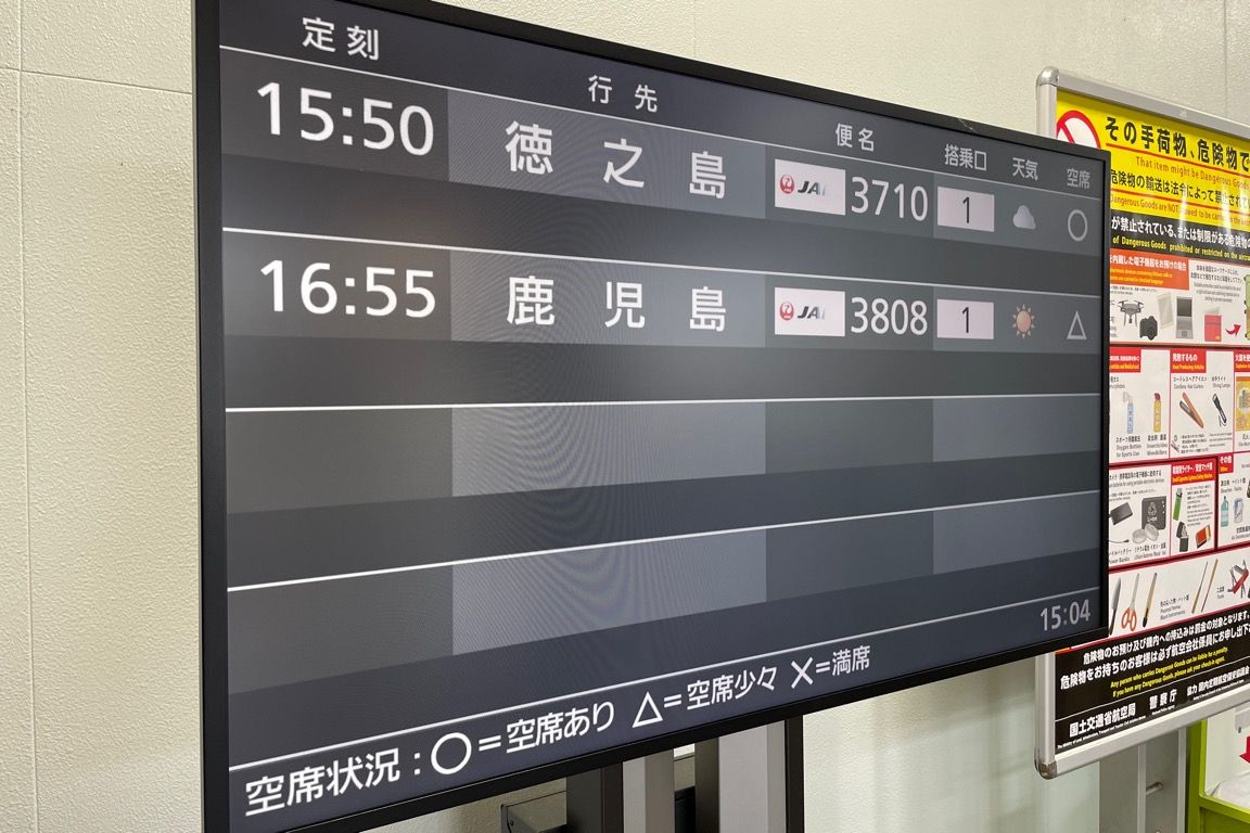 やがて到着便の乗客がターミナルに流れ込むと、再度保安検査を受けた乗客で待合室もやや混雑し始める。やはり乗り継ぎ客の多さが目立つ。一方で、沖永良部から搭乗する人も一定数見られた。この日は、搭乗便の前に出発する鹿児島行きが機材繰りの影響で欠航となっており、徳之島での乗り継ぎに振り替えた乗客もいたようだった。